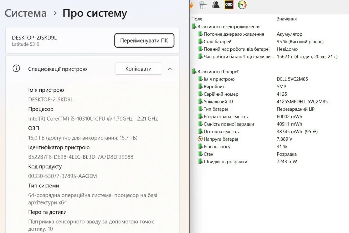- Батарея: щонайменше 2-4 години в режимі звичайного навантаження, 31% зношення