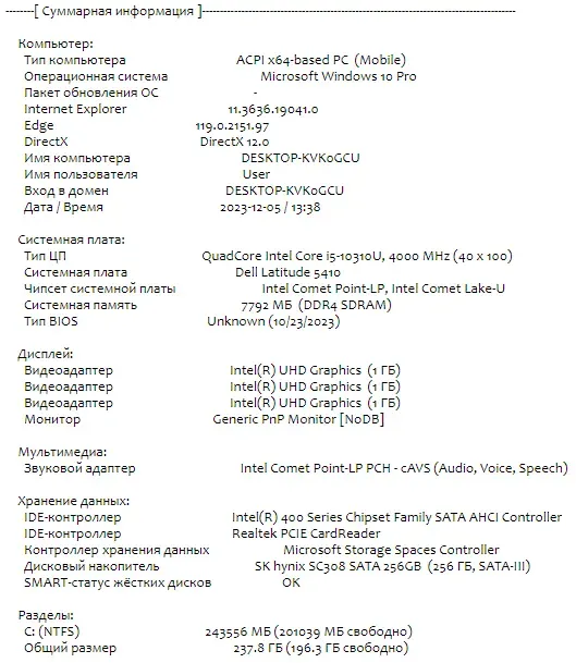 - Постійна пам'ять: 256 GB SSD M.2 (SK hynix SC308)