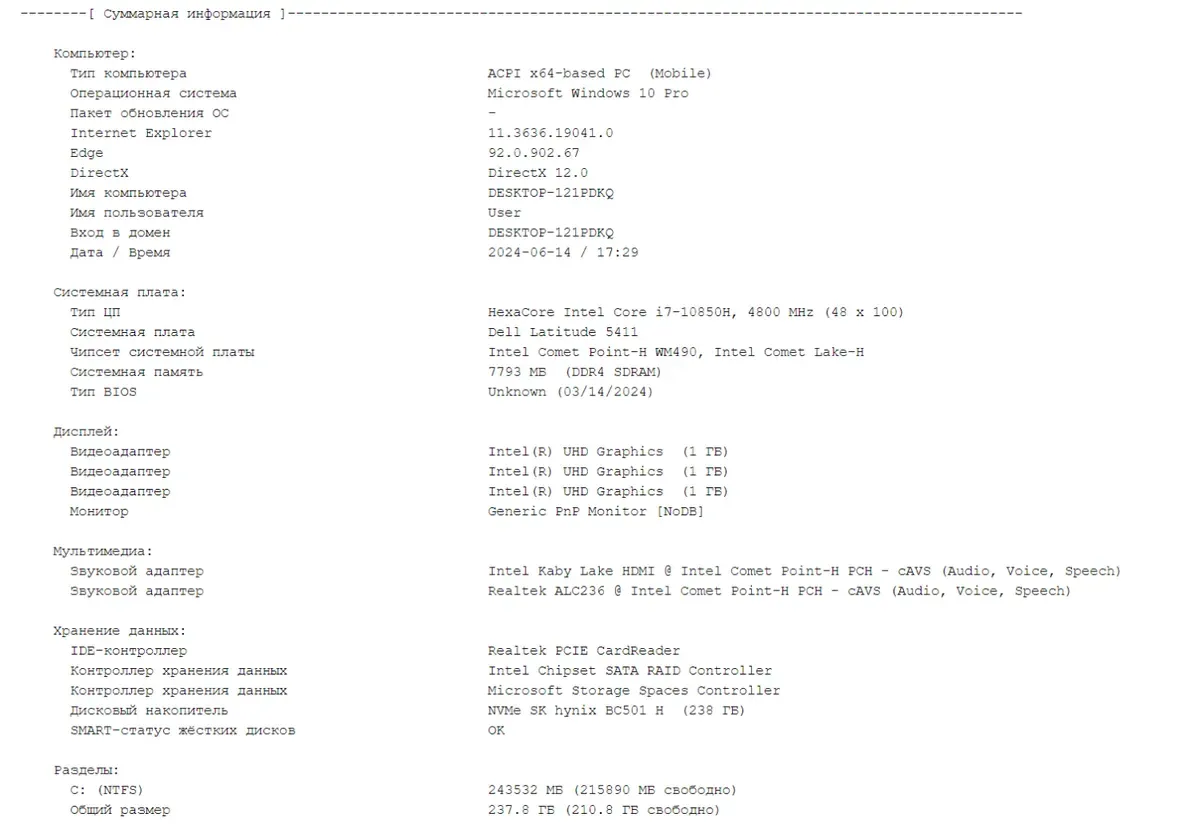 - Постійна пам'ять: 240 GB SSD M.2 NVMe (SK Hynix BC501 H)