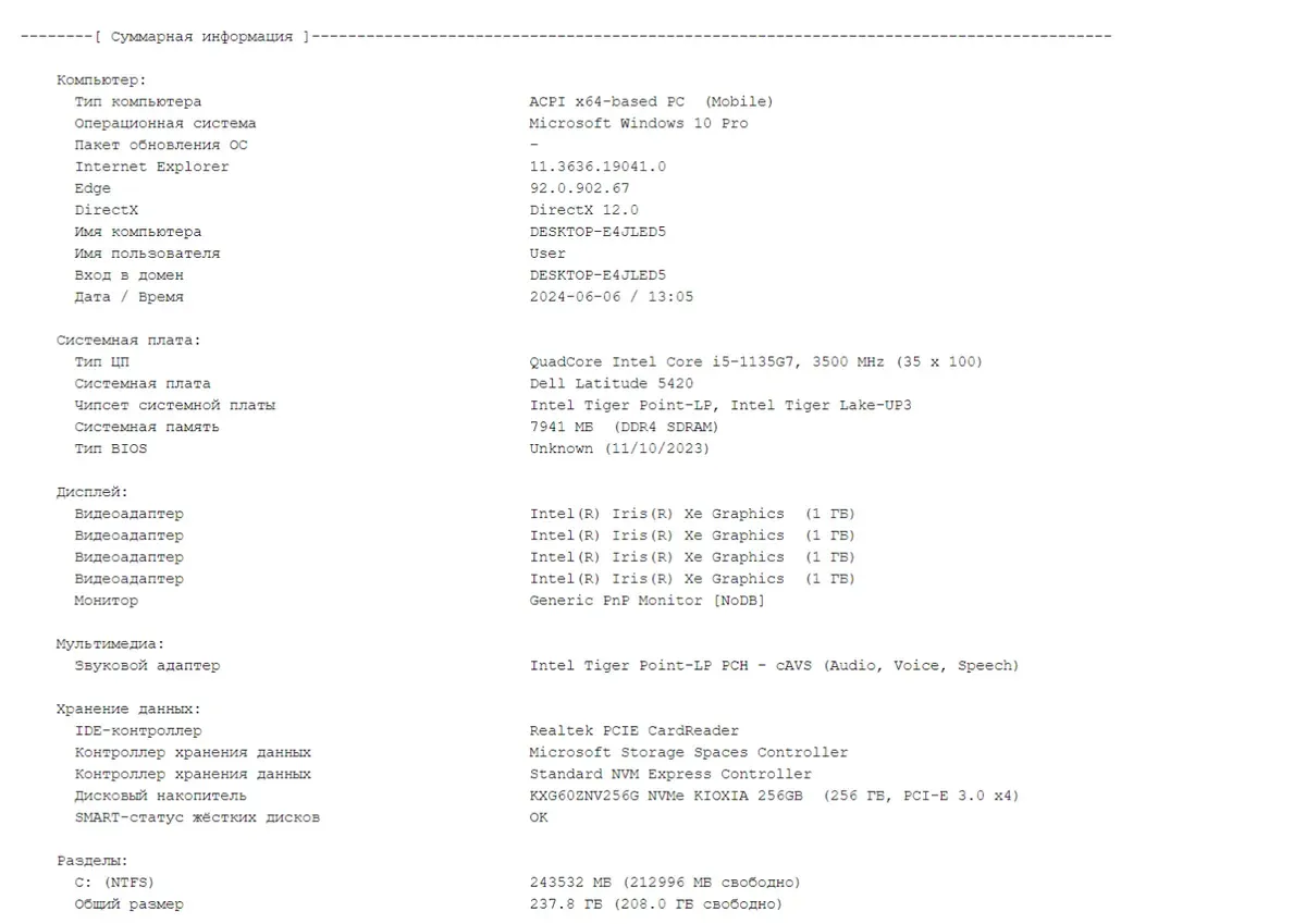 - Постійна пам'ять: 256 GB SSD M.2 NVMe (KIOXIA KXG60ZNV256G, PCI-E 3.0 x4)