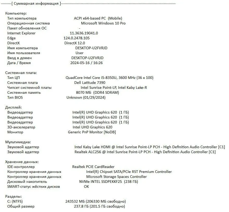 - Постійна пам'ять: 240 GB SSD M.2 NVMe (Intel SSDPEKKF25)