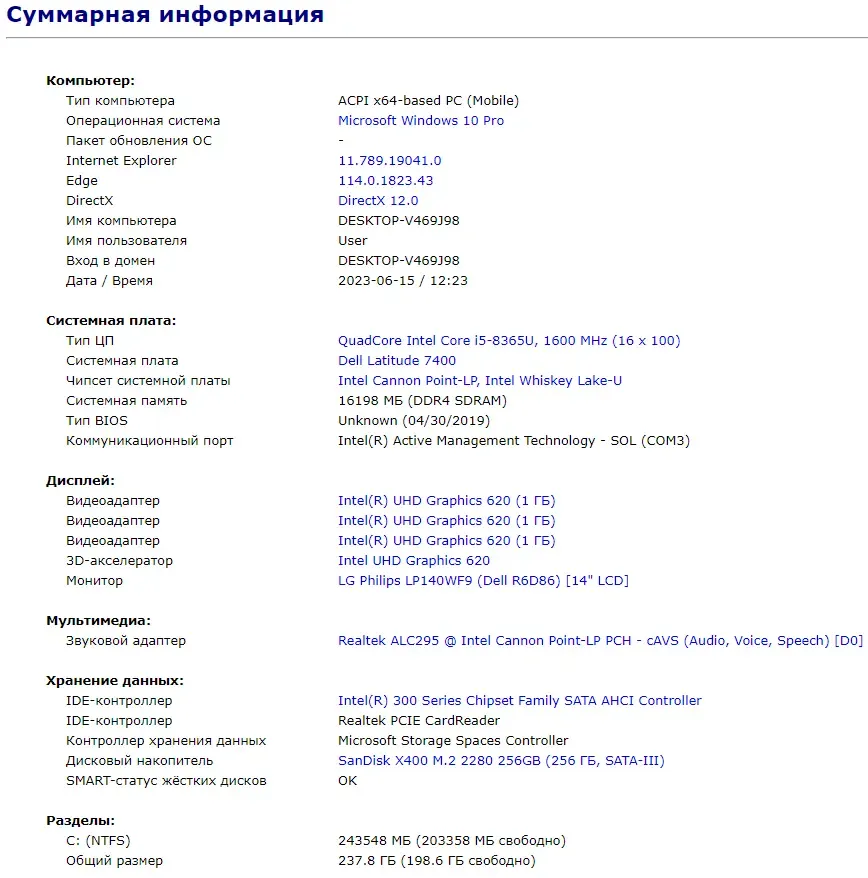 - Постійна пам'ять: 256 GB SSD M.2 (SanDisk X400)