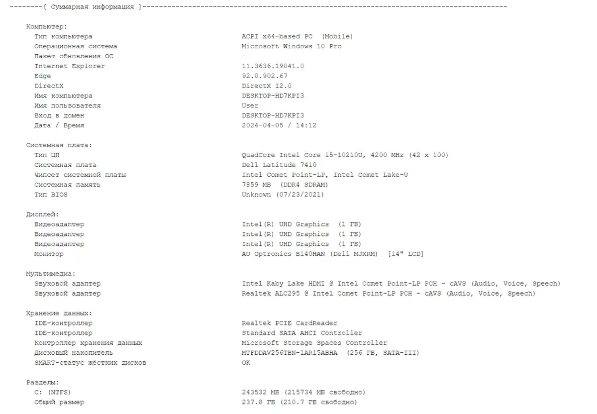 - Процесор: Intel Core i5-10210U (4 (8) ядра по 1.6 - 4.2 GHz), 6 MB Smart Cache