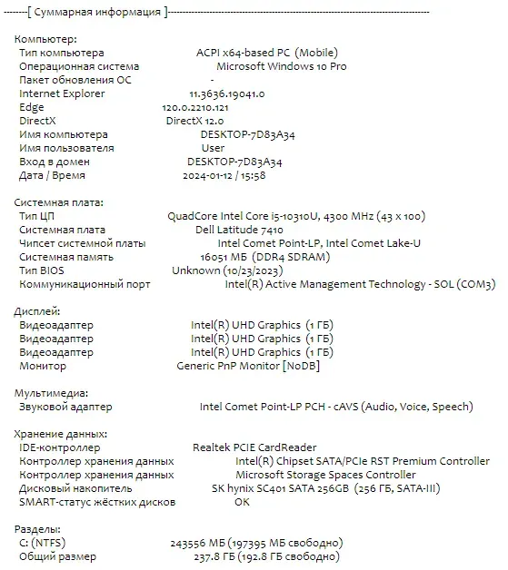 - Постійна пам'ять: 256 GB SSD M.2 (SK hynix SC401)