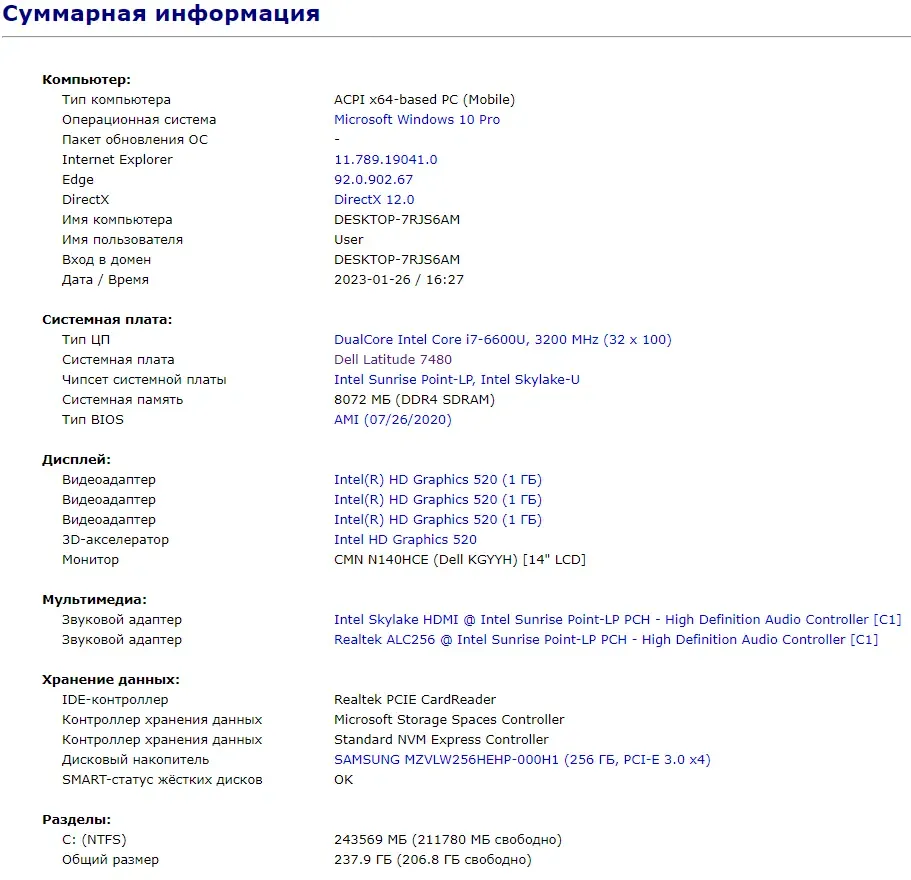 - Процесор: Intel Core i7-6600U (2 (4) ядра по 2.6 - 3.4 GHz), 4 MB Smart Cache
