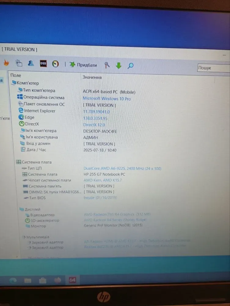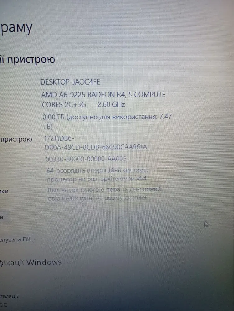 - Процесор: AMD A6-9225 (2 ядра по 2.6 - 3.0 GHz), 1 MB Cache