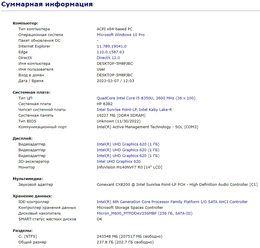 - Постійна пам'ять: 256 GB SSD M.2 (Micron_M600_MTFDDAV256MBF)