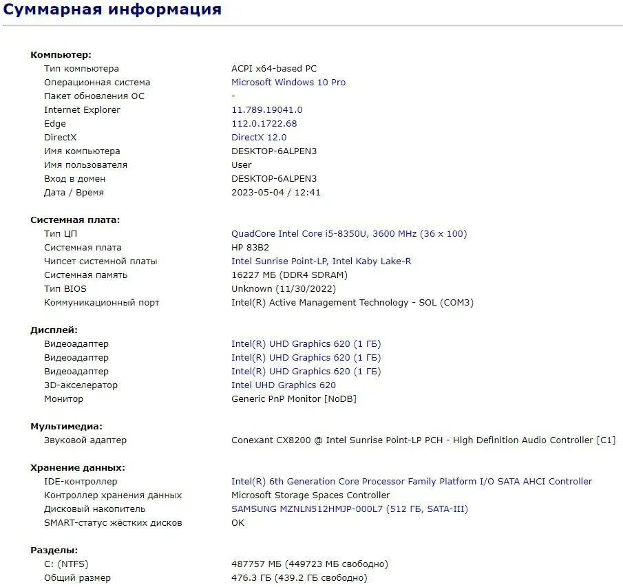- Процесор: Intel Core i5-8350U (4 (8) ядра по 1.7 - 3.6 GHz), 6 MB Smart Cache