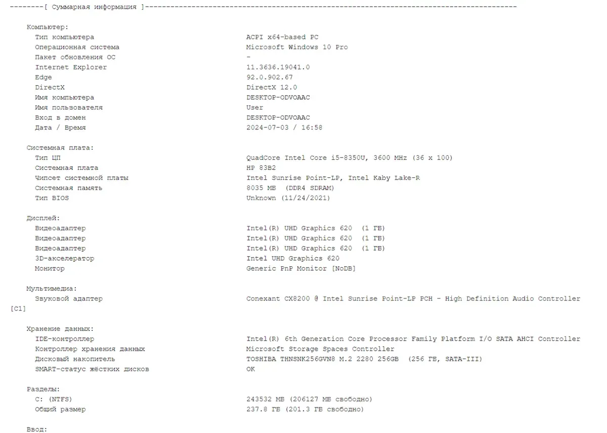 - Постійна пам'ять: 256 GB SSD M.2 NVMe (Toshiba THNSNK256GVN8 M.2 2280)