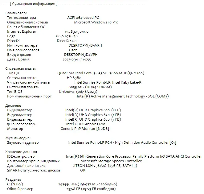 - Постійна пам'ять: 256 GB SSD M.2 (LiteOn L8H-256V2G)