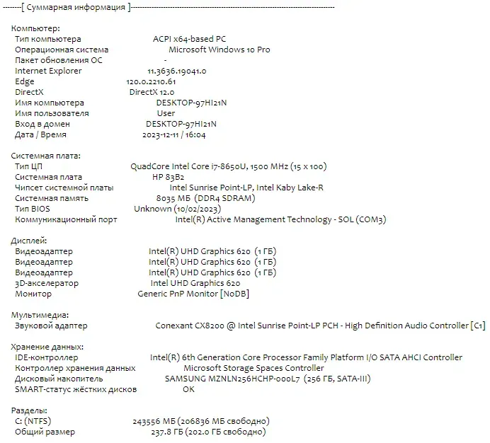 - Процесор: Intel Core i7-8650U (4 (8) ядра по 1.9 - 4.2 GHz), 8 MB Smart Cache