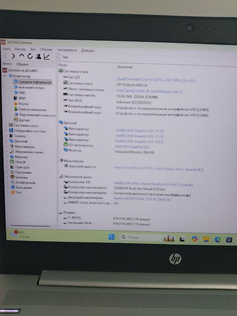 - Процесор: Intel Core i5-8265U (4 (8) ядра з тактовою частотою 1,6–3,9 ГГц), 6 МБ Smart Cache