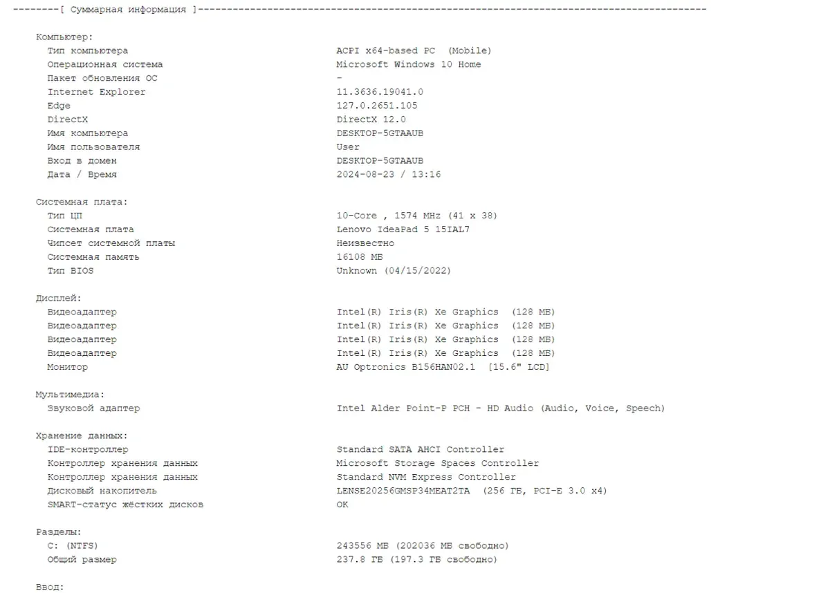 - Постійна пам'ять: 256 GB SSD (LENSE20256GMSP34MEAT2TA)