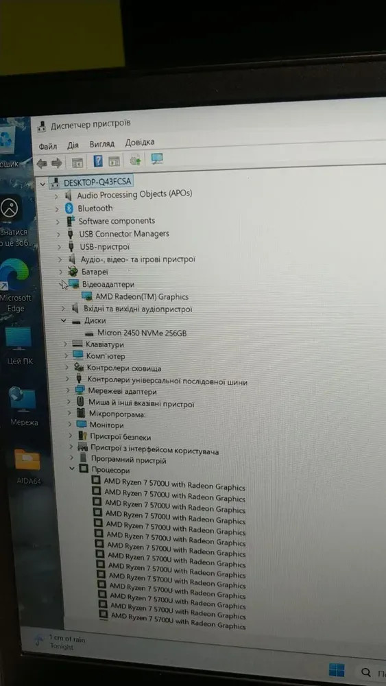 - Процесор: AMD Ryzen 7 5700U (8 (16) ядер по 1.8 - 4.3 GHz), 8 MB Cache