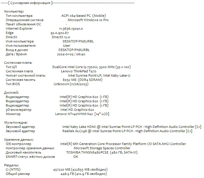 - Постійна пам'ять: 480 GB SSD (Toshiba THNSN8480PCSE)