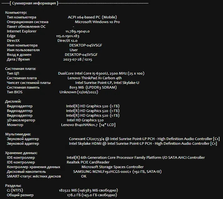 - Модель: Lenovo ThinkPad X1 Carbon (4th Gen)