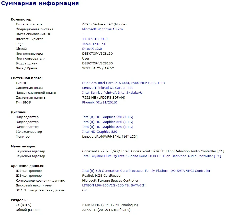- Модель: Lenovo ThinkPad X1 Carbon (4th Gen)