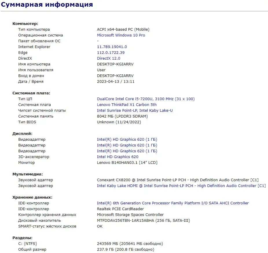 - Модель: Lenovo ThinkPad X1 Carbon (5th Gen)