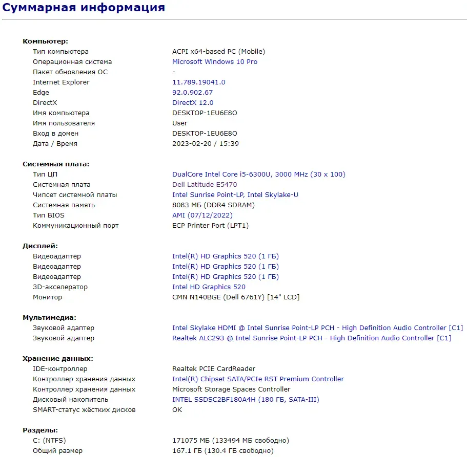 - Постійна пам'ять: 180 GB SSD (Intel SSDSC2BF180A4H)