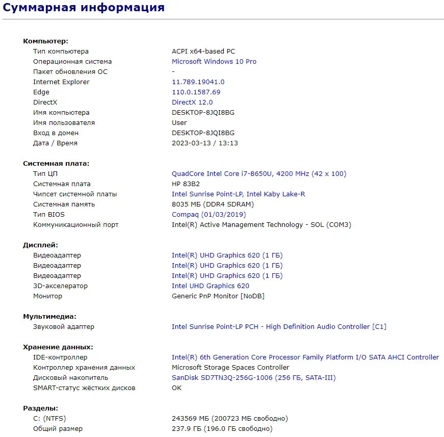 - Постійна пам'ять: 256 GB SSD M.2 (SanDisk SD7TN3Q-256G-1006)