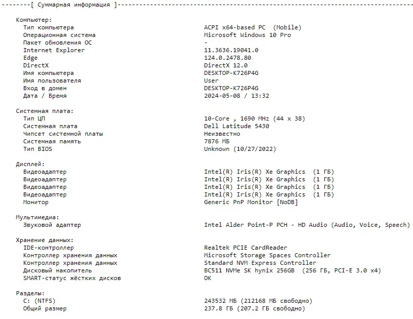- Постійна пам'ять: 256 GB SSD M.2 NVMe (SK hynix BC511)