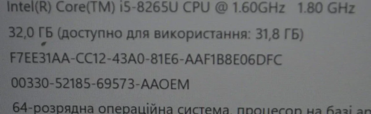 - Процесор: Intel Core i5-8265U (4 (8) ядра по 1.6 - 3.9 GHz), 6 MB Smart Cache