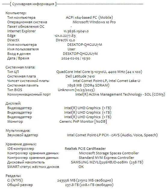 - Процесор: Intel Core i5-10310U (4 (8) ядра по 1.7 - 4.4 GHz), 6 MB Smart Cache