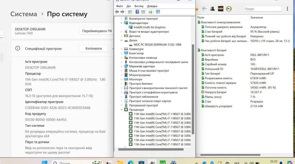 - Процесор: Intel Core i7-1185G7 (4 (8) ядра по 3.0 - 4.8 GHz); Cache Memory 12 MB