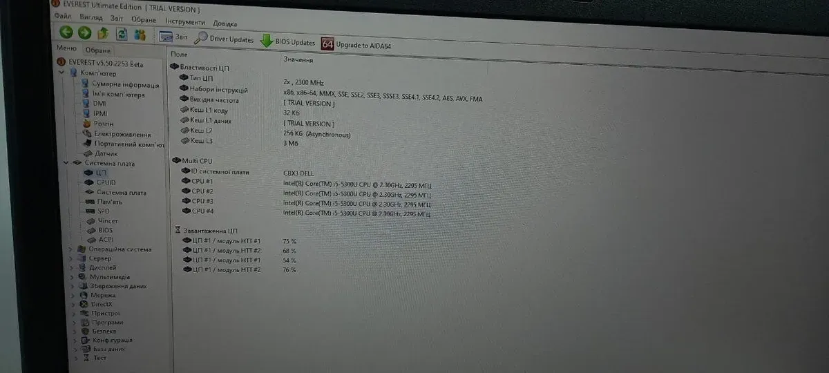 - Процесор: Intel Core i5-5300U (2 (4) ядра по 2.3 - 2.9 GHz); Cache Memory 3 MB
