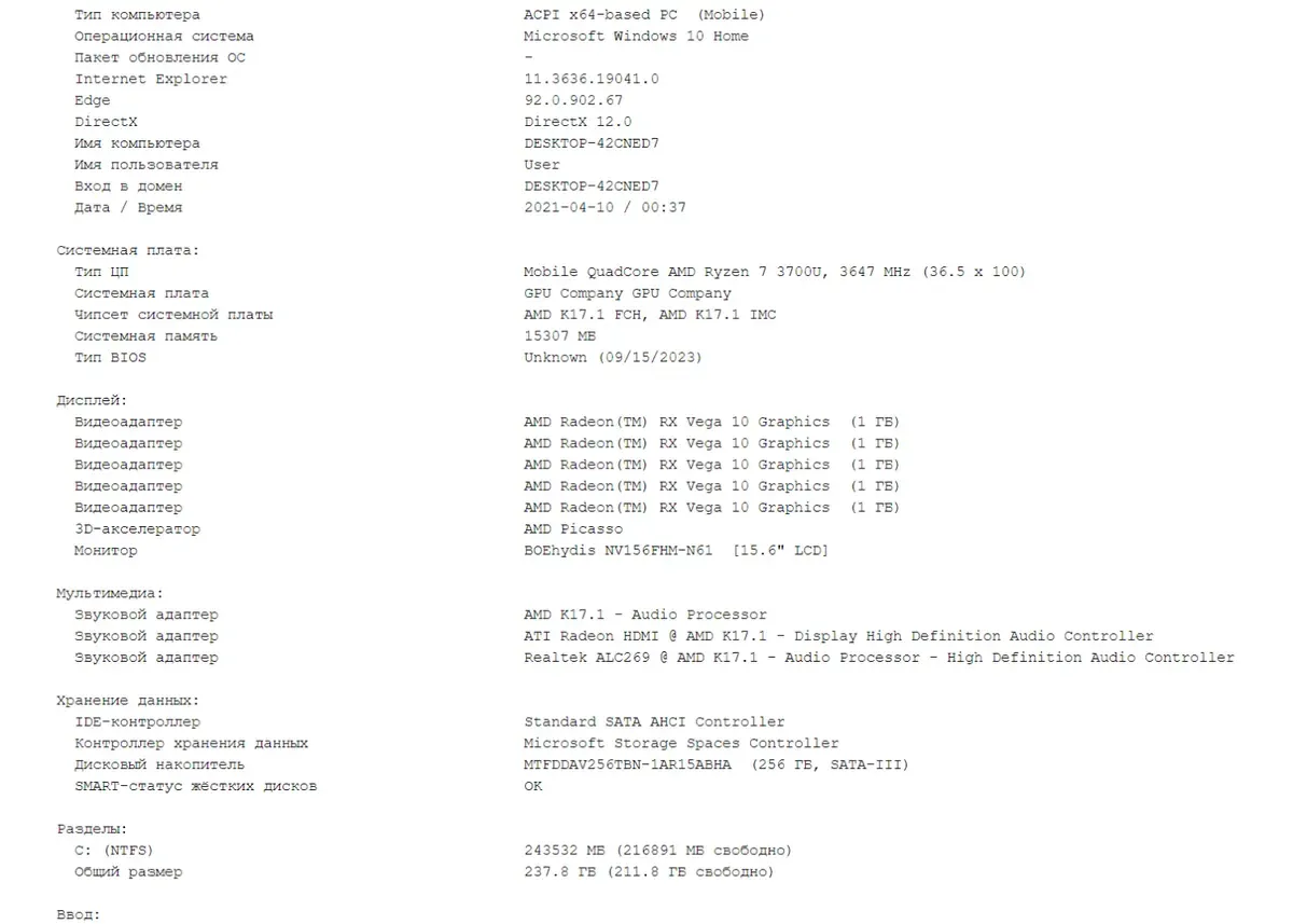 - Процесор: AMD Ryzen 7 3700U (4 (8) ядра по 2.3 - 4.0 GHz), 4 MB Cache