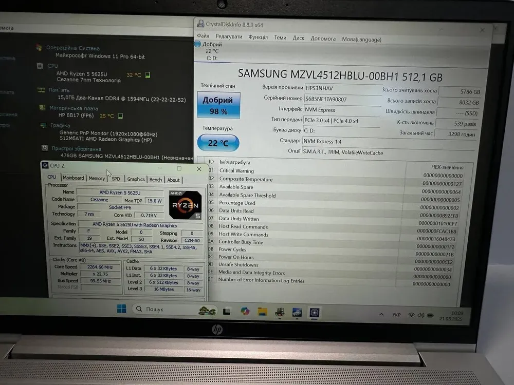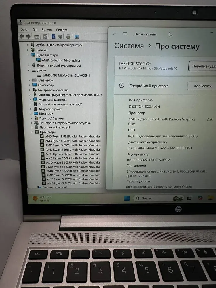 - Процесор: AMD Ryzen 5 5625U (6 (12) ядер по 2.3 - 4.3 GHz), 16 MB Cache