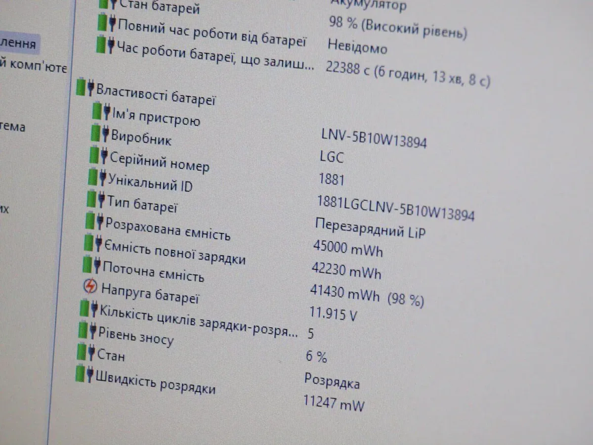 - Батарея: щонайменше 4-5 годин у режимі звичайного навантаження, 6% зносу.