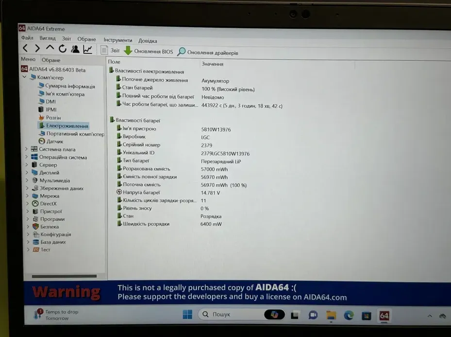 - Батарея: не менше 7-8 годин у режимі звичайного навантаження; 11 циклів, рівень зносу 0%