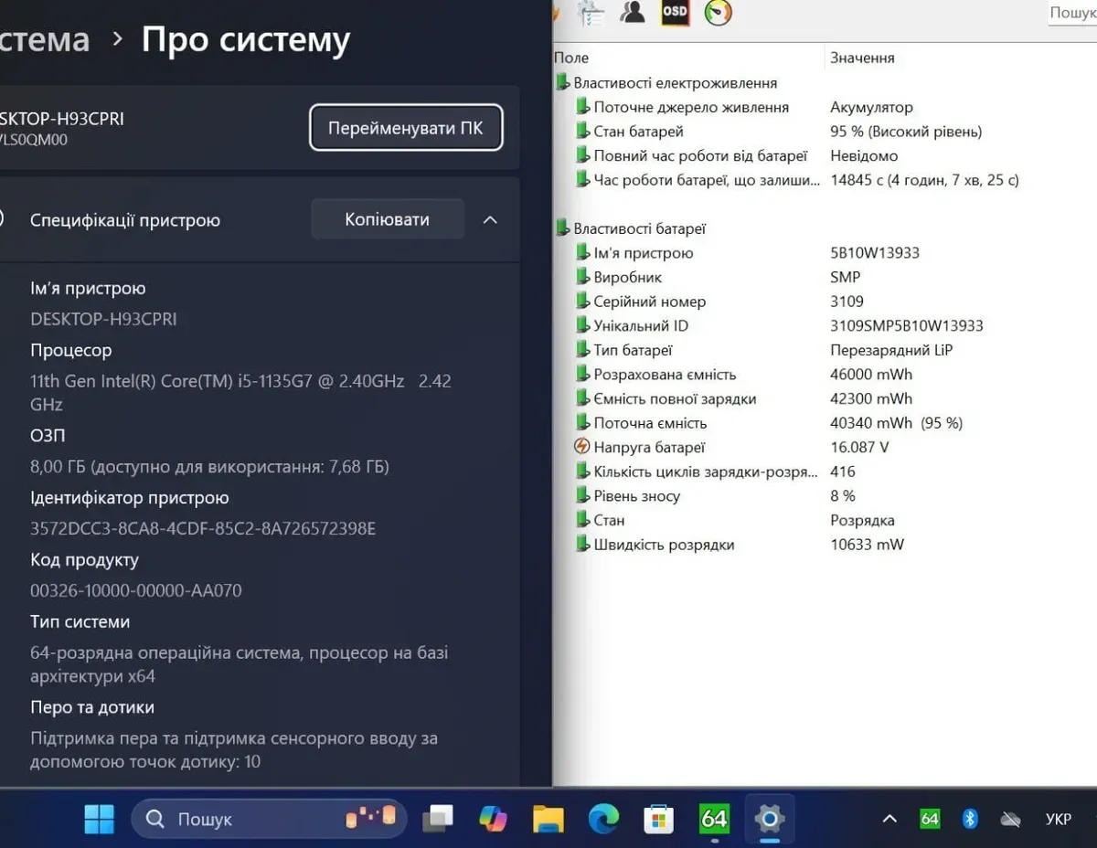 - Процесор: Intel Core i5-1135G7 (4 (8) ядра по 2.4 - 4.2 GHz); Cache Memory 8 MB