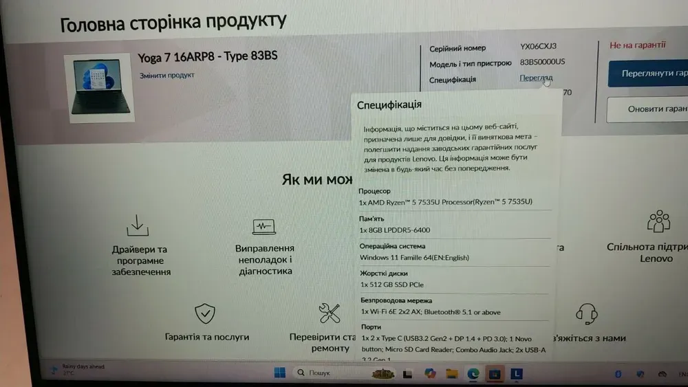 - Процесор: AMD Ryzen 5 7535U (6 (12) ядер по 2.9 - 4.55 GHz); Cache Memory 16 MB