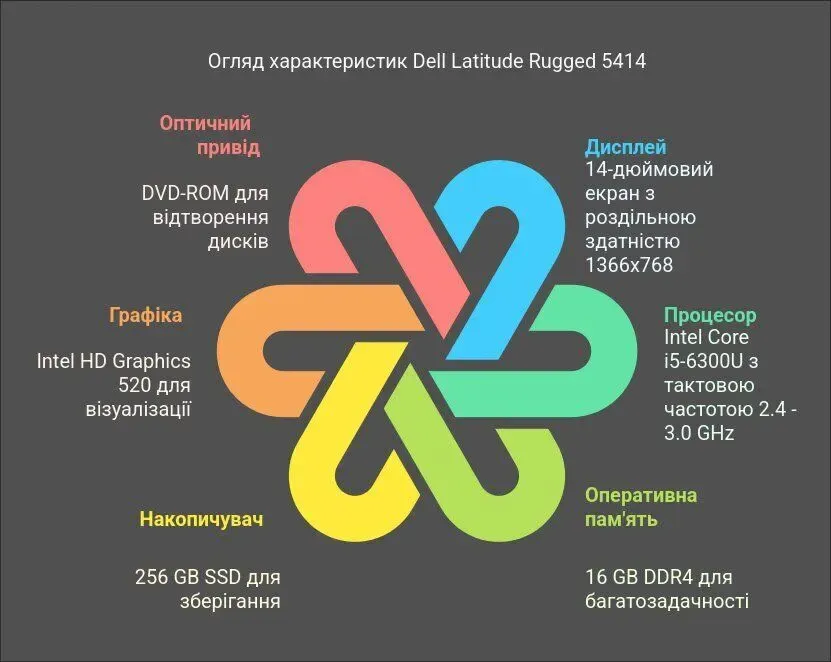 Захищений ноутбук Dell Latitude 5414 Rugged з екраном 14" (1366x768) TN на базі процесора Intel Core i5-6300U та оперативної пам'яті 16 GB DDR4 для офісної роботи та домашніх завдань