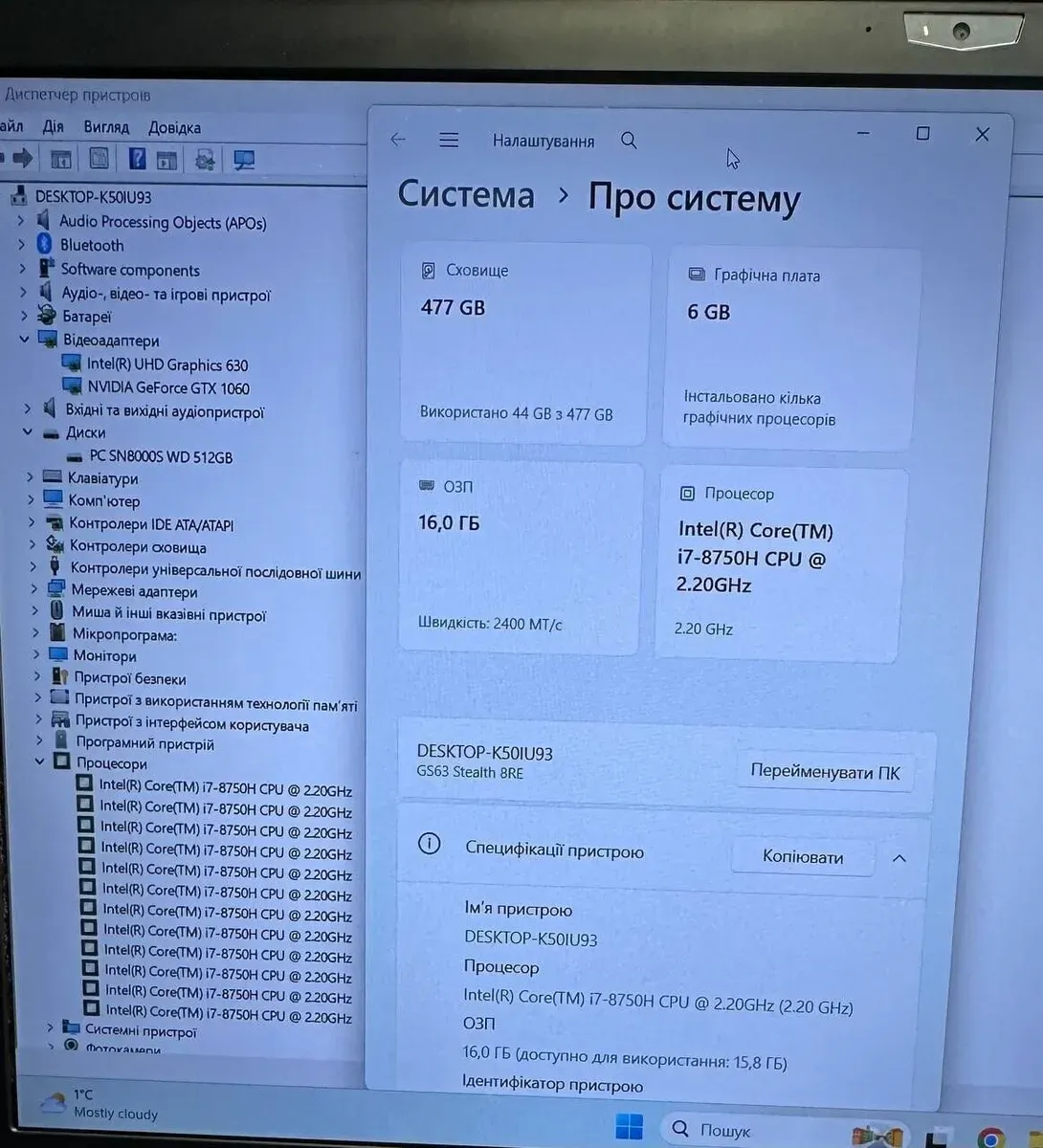 - Процесор: Intel Core i7-8750H (6 (12) ядер з тактовою частотою 2,2–4,1 ГГц), 9 МБ Smart Cache