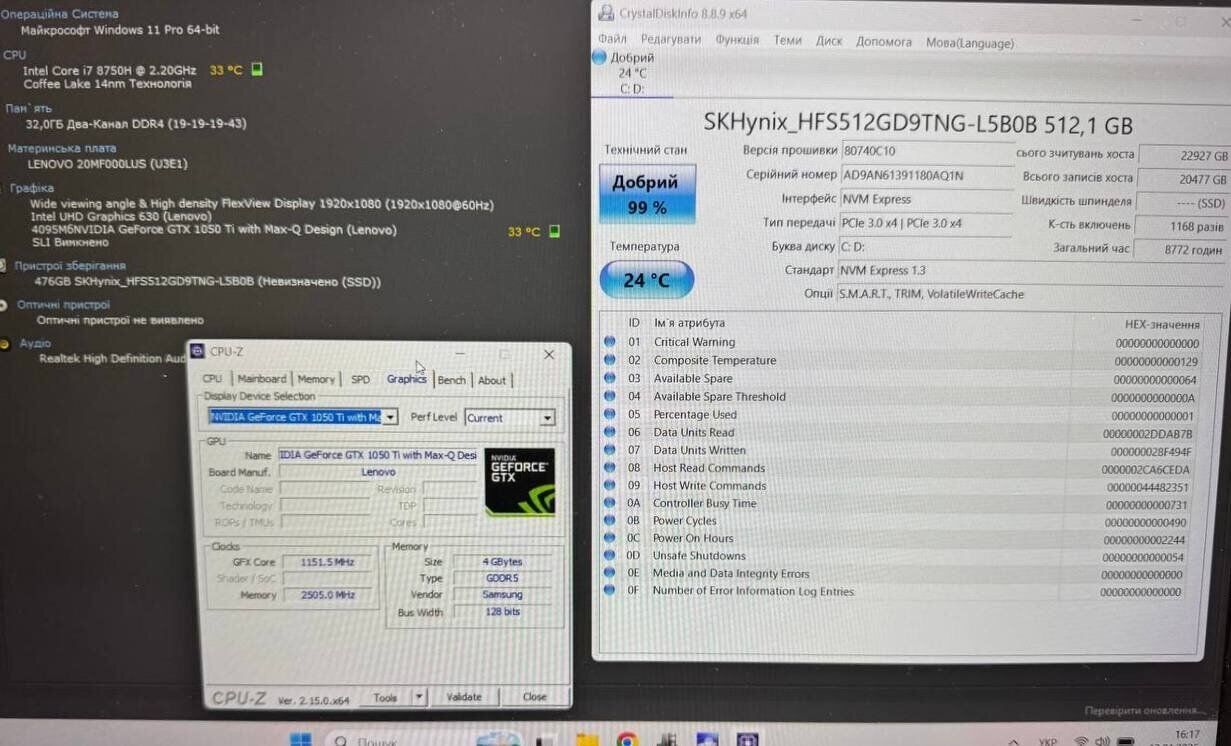 - Графіка: дискретна nVidia GeForce GTX 1050 Ti Max-Q, 4 GB GDDR5, 128-bit