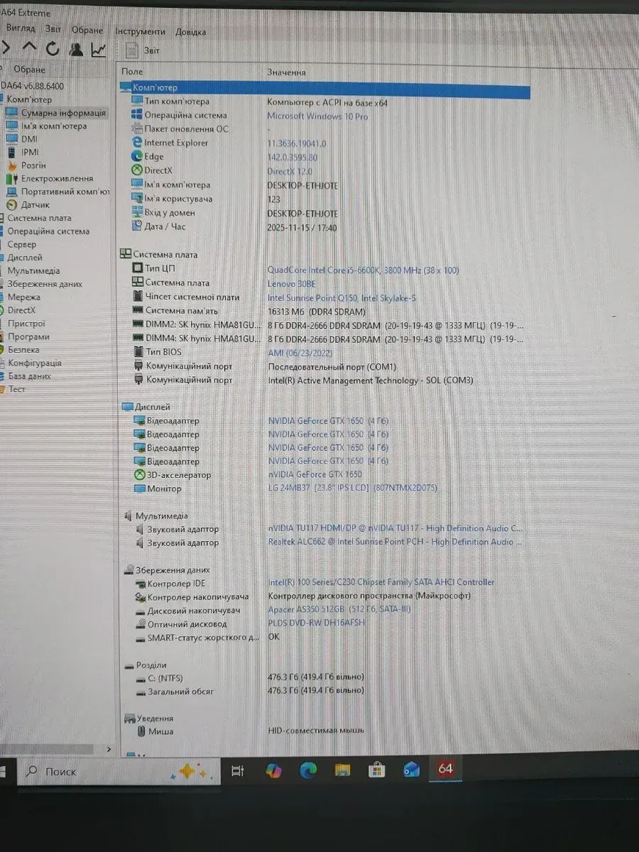 Комплект: Lenovo ThinkCentre M800 Tower / Intel Core i5-6600K (4 ядра по 3,5 - 3,9 ГГц) / 16 ГБ DDR4 / 512 ГБ SSD / nVidia GeForce GTX 1650, 4 ГБ GDDR5, 128-біт / DVD-ROM + Монітор LG 24MB37PM-B / 24" (1920x1080) IPS б/в