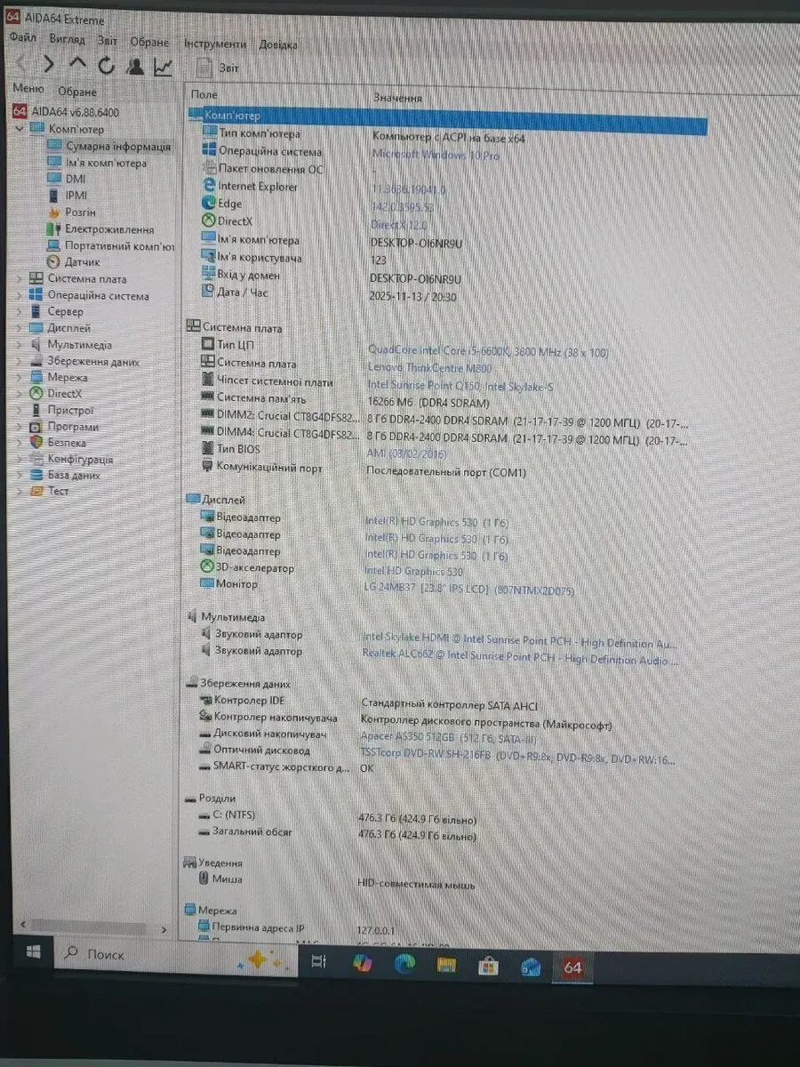 Комплект: Lenovo ThinkCentre M800 Tower / Intel Core i5-6600K (4 ядра по 3,5 - 3,9 ГГц) / 16 ГБ DDR4 / 512 ГБ SSD / nVidia P106-100, 6 ГБ GDDR5, 192-біт / DVD-ROM + Монітор LG 24MB37PM-B / 24" (1920x1080) IPS б/в
