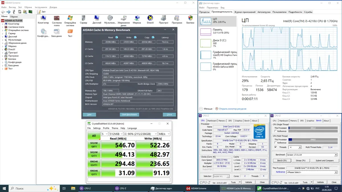 - Процесор: Intel Core i5-4210U (2 (4) ядра по 1.7 - 2.7 GHz), 3 MB Smart Cache