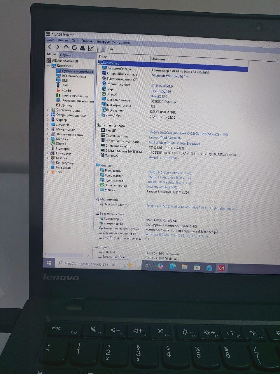Ноутбук Б-клас Lenovo ThinkPad T450s з екраном 14" (1600x900) TN на базі процесора Intel Core i5-5200U і оперативної пам'яті 12 GB DDR3 для офісної роботи і домашніх завдань